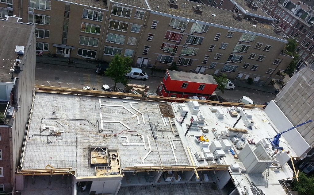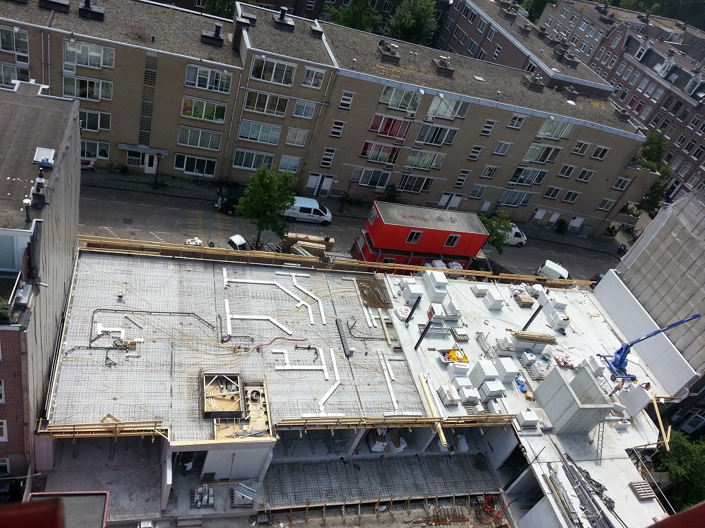 1e verdiepingsvloer 25 juli 2013 blok 2 Fagelstraat Amsterdam. Opname vanuit de bouwkraan. De breedplaten zijn gelegd en men is bezig de binnenriolering en de luchtkanalen van de airconditioning te monteren zodat die in de betonvloer kunnen worden gestort. Delen: Oudere berichten Bouwlogistiek Nieuwere berichten Begane grond gereed