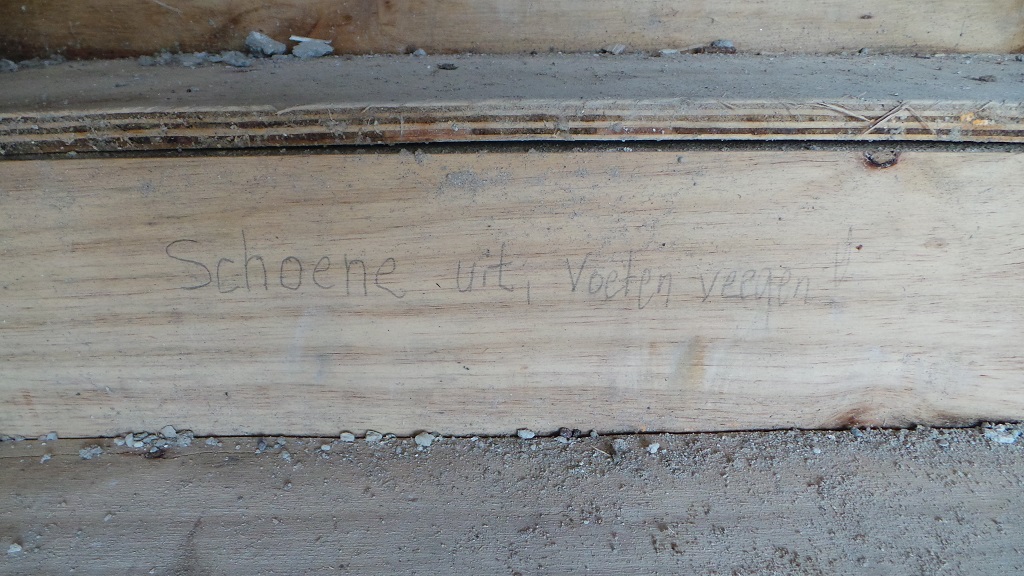 blok 1 Jacob Catskade Amsterdam. Betontrappen worden tijdens de bouw intensief gebruikt en ter voorkoming van beschadiging goed ingepakt met vilt en planken. Deze bouwvakker ging nog verder: ‘schoene uit en voeten veegen!’