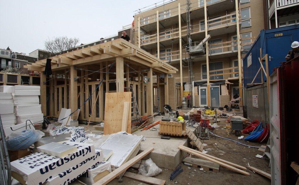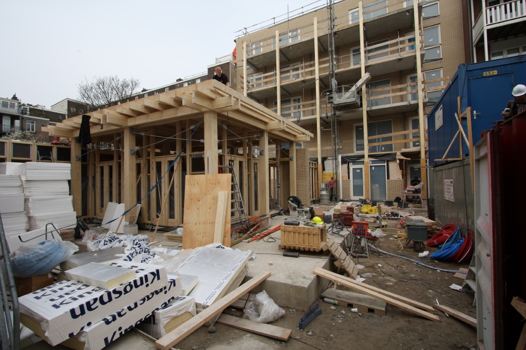 De bouwkraan is uit het gemeenschappelijk tuinpaviljoen gehesen en de constructie met het zeer duurzame Accoya hout verloopt voorspoedig. Alle platte daken in het binnenterrein zullen binnenkort met een groene mos-sedum begroeiing bedekt worden.