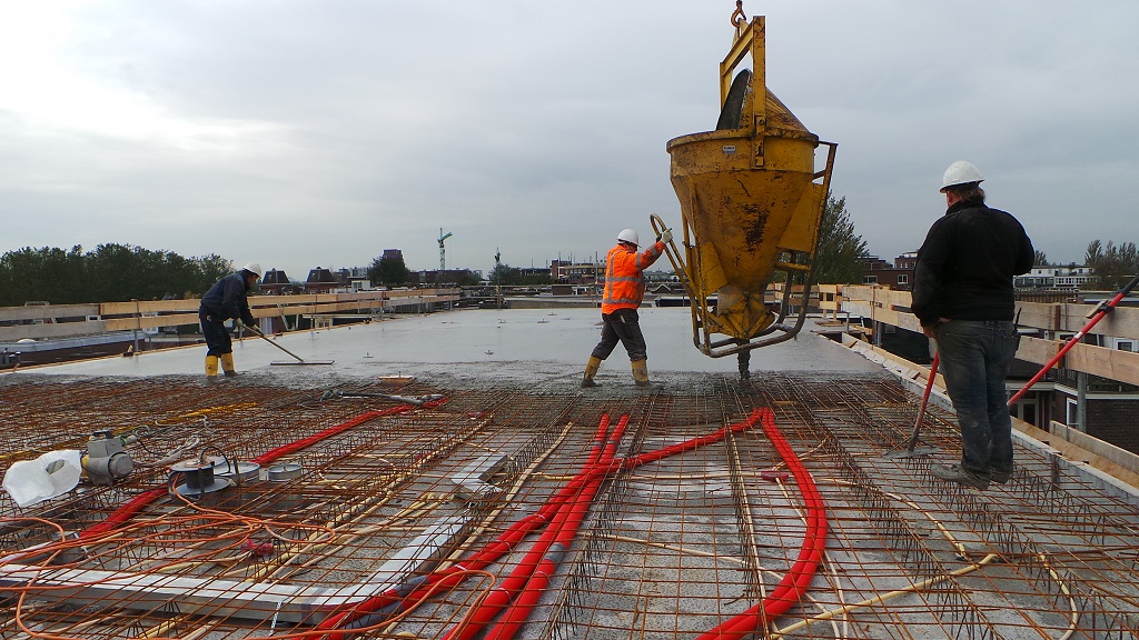 blok 2 Fagelstraat Amsterdam. Geduldig wordt kuub voor kuub het beton gestort en vervolgens gladgestreken. Tijdens het wachten op het vullen van de kubel door een betonauto vliegen deze heren bij het zien van de camera elkaar spontaan in de armen. Goede werksfeer!