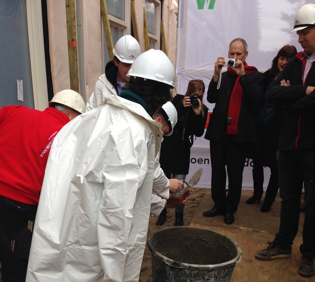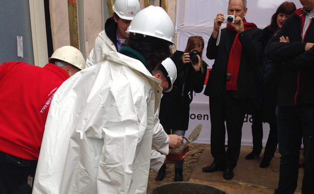 De eerste steen 28 november 2013 Het leggen van de eerste steen is een feestelijk en symbolisch moment: het is de eerste keer dat alle partijen (opdrachtgevers, gebruikers, adviseurs, bouwers etc.) tegelijk aanwezig zijn. En tijd voor het fotomoment… Delen: Oudere berichten Uitzicht Westertoren Nieuwere berichten Bakstenen hijsen