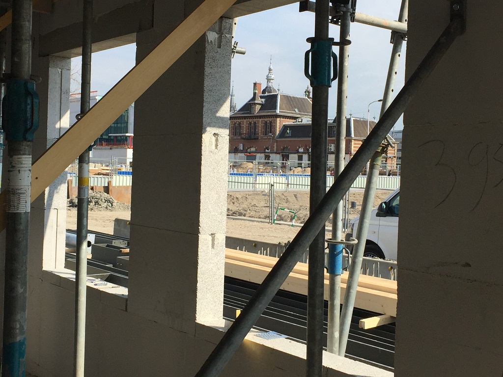 Gluren naar de buren: Station Delft 14 april 2016 Grachtenhuis Nieuw Delft. Op de begane grond is staande tussen de stempels het uitzicht naar de Spoorzone met het oude en nieuwe station nu voor het eerst goed te zien Delen: Oudere berichten 1e verdiepingsvloer Nieuwere berichten Bergingen onder de poort