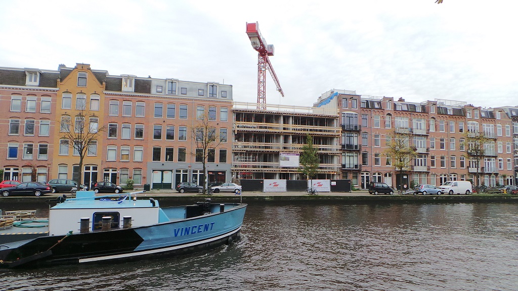 blok 1 Jacob Catskade Amsterdam. In gestaag tempo wordt het ‘gat’ in deze gevelwand geheeld. Ondertussen vaart Vincent wekelijks langs; het Kattengat is een drukke vaarroute voor de beroepsvaart, vandaar dat woonboten hier ontbreken