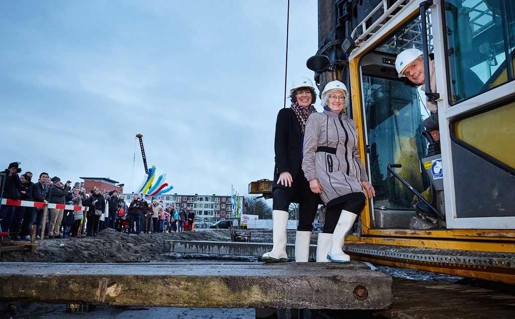 Door alle participanten en particuliere opdrachtgevers aangemoedigd aan Minister Blok de eer om in gezelschap van Chieni Haak (cpo opdrachtgever) en Liesbeth Janson (architect) de feestpaal van het Grachtenhuis de grond in te slaan.