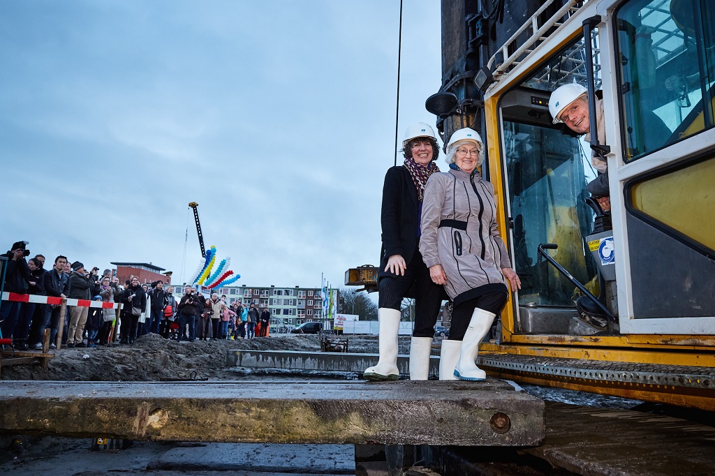 Door alle participanten en particuliere opdrachtgevers aangemoedigd aan Minister Blok de eer om in gezelschap van Chieni Haak (cpo opdrachtgever) en Liesbeth Janson (architect) de feestpaal van het Grachtenhuis de grond in te slaan.