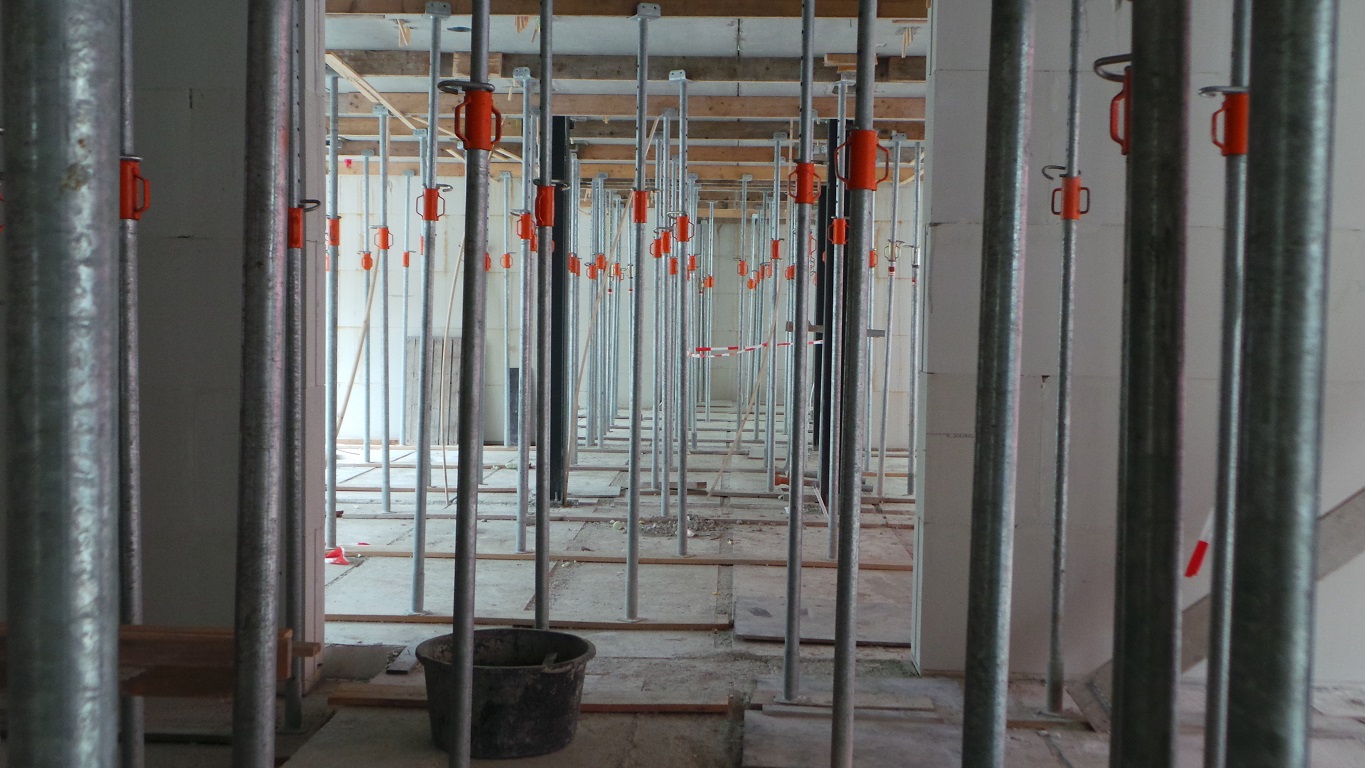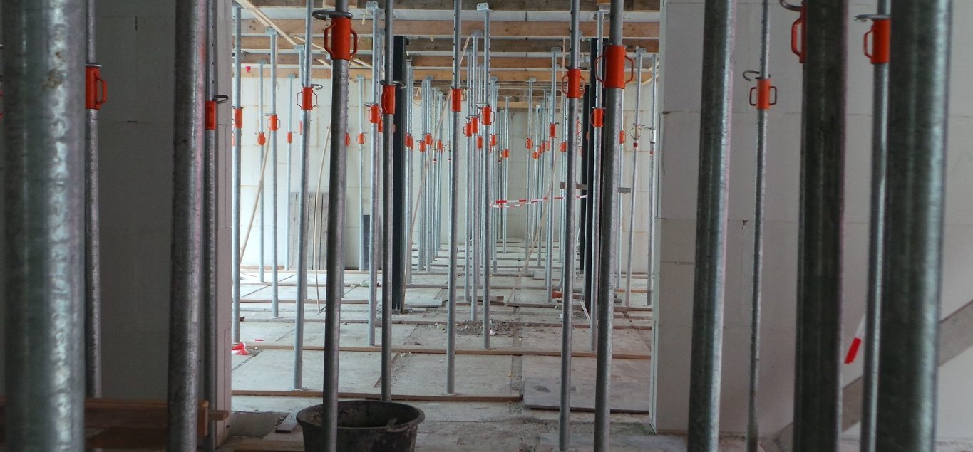 blok 2 Fagelstraat Amsterdam. Tientallen stempels zijn geplaatst om het gewicht van de gestorte betonvloer te dragen totdat deze voldoende is uitgehard. De stempels op de begane grond worden gefaseerd verwijderd wanneer de 3e verdiepingsvloer is gestort.