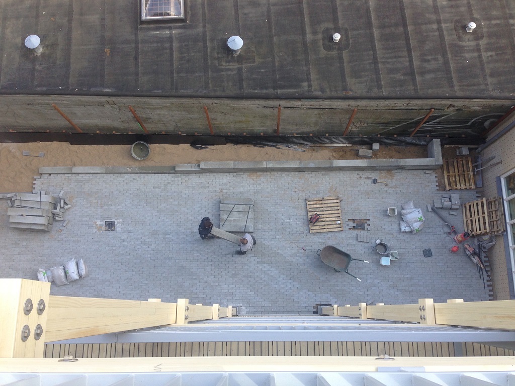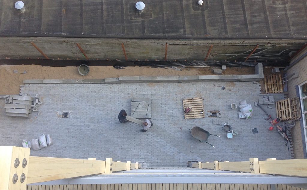 Fagelstraat, de patio voor de woongroepen van Amsta wordt ingericht. De grauwe muur van de aangrenzende garage zal verdwijnen achter vertikale tuinelementen. Daarnaast heeft elke woongroep op de verdieping een houten veranda van ruim 20 mtr lengte als buitenruimte.