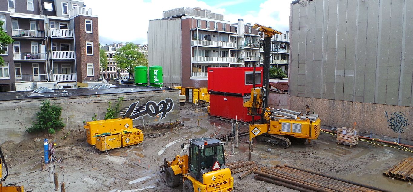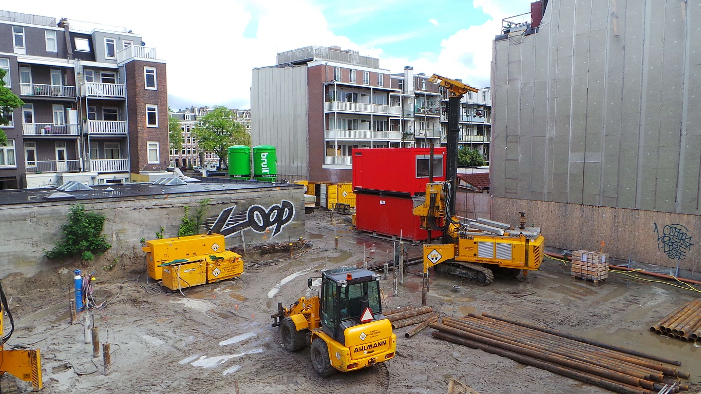 blok 2 Fagelstraat Amsterdam. Omdat de fundering van de belendende panden in een niet al te beste staat is en om geluidsoverlast te voorkomen is gekozen om de funderingspalen te boren en in de grond te vormen. De enige uitslag van de trillingsmeter is wanneer een vrachtauto door de straat rijdt.