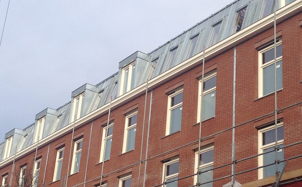Zinken dakkapellen 4 maart 2014 Blok 2 Fagelstraat. De gevel komt uit de steigers te voorschijn: het gevelmetselwerk is gereed. Nu is ook het zinken dak met de dakkapellen goed te zien. De vierkante zinken regenpijpen zijn in het buitenspouwblad opgenomen. Delen: Oudere berichten Afbouw meters maken Nieuwere berichten Uitzicht overburen